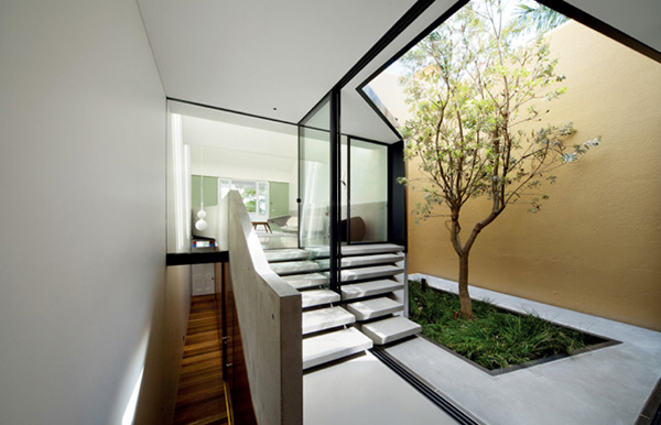Để tận dụng tối đa ánh sáng tự nhiên trên cao, các kiến trúc sư đưa các khu vực sinh sống chủ yếu ở tầng trên cùng, và phòng ngủ chôn cất trên chính. Đó không phải để nói rằng tầng chính là “chôn” bởi bất kỳ phương tiện – một bức tường cao từ sàn đến trần nhà bằng kính trong nhà ở phía sau nhìn ra sân trong ở trung tâm của kế hoạch ngôi nhà này.